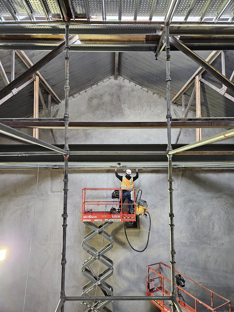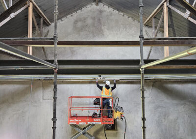 - Seismic Strengthening: A fully reinforced 12-inch interior shotcrete shell preserves the historic masonry exterior while ensuring long-term structural stability. A new horizontal steel roof truss and foundation waterproofing further enhance resilience.