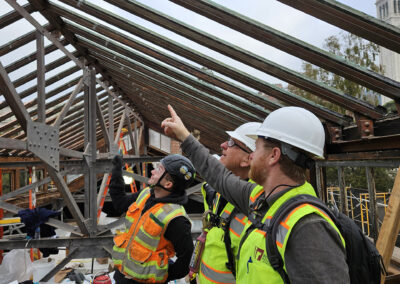 - Skylight Monitor Restoration: The historic skylight structure was preserved and rehabilitated with new laminated glazing and Honduran mahogany window frames to match the deteriorated originals. Copper flashing was replaced and extended to protect against future water intrusion, and all operable components were restored.